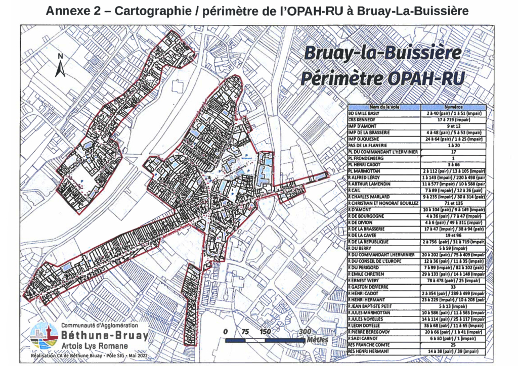 La Ville de Bruay‐La‐Buissière a décidé par délibération du Conseil Municipal du 9 juillet 2022 de mettre en place une politique d’incitation à la rénovation des vitrines commerciales situées dans le secteur ACV ‐ OPAH‐RU, dont le plan est disponible ci-dessous.