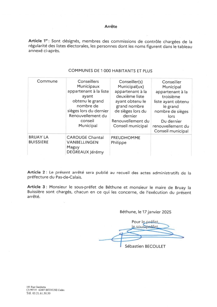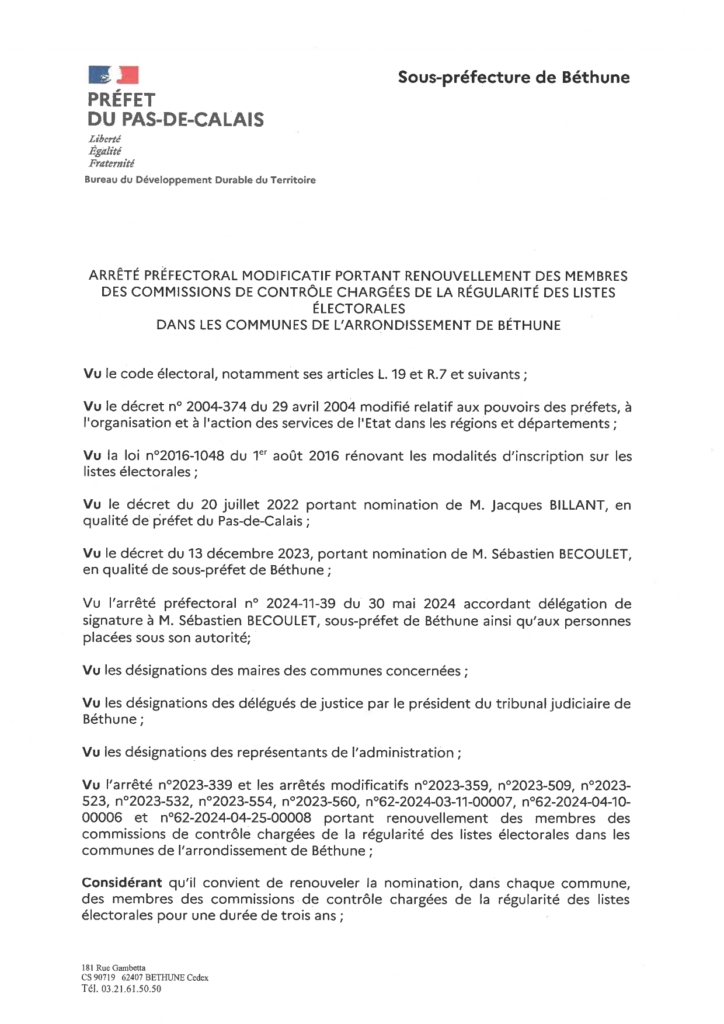 Arrêté préfectoral modificatif portant renouvellement des membres des commissions de contrôle chargées de la régularité des listes électorales dans les communes de l’arrondissement de Béthune.